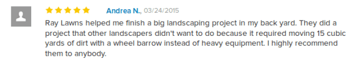 Ray Lawns helped me finish a big landscaping project in my backyard. They did a project that other landscapers didn’t want to do because it required moving 15 cubic yards of dirt with a wheel barrow instead of heavy equipment. I highly recommend them to anybody.